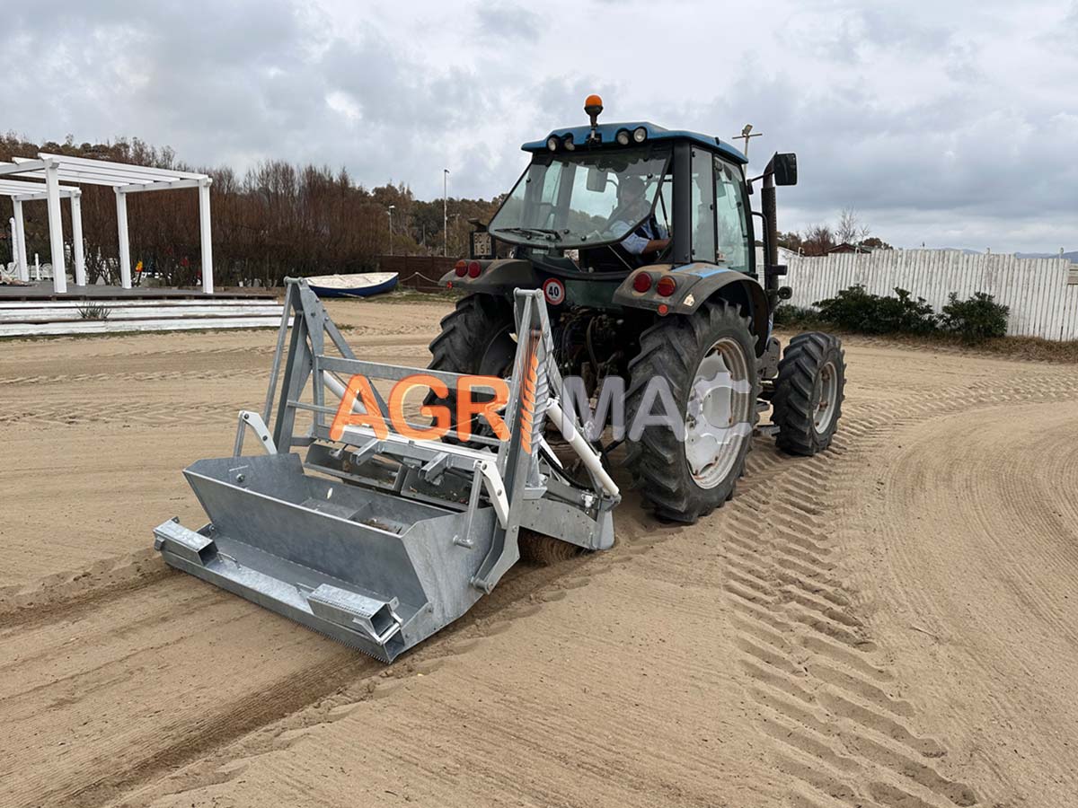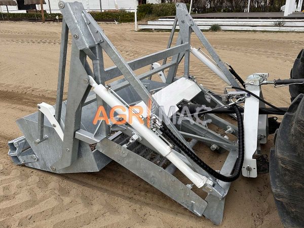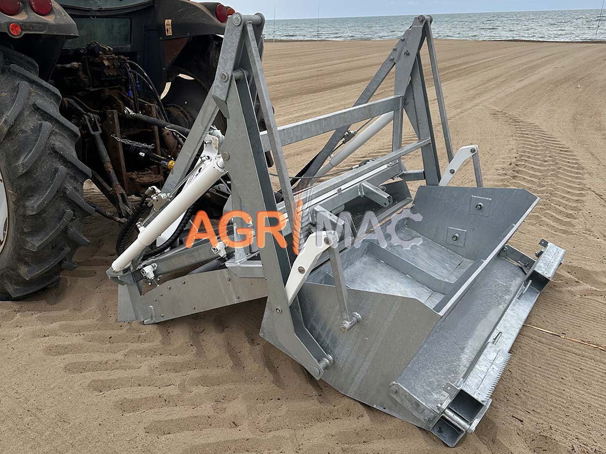 Μηχάνημα καθαρισμού παραλίας ρυμουλκούμενο με τρακτέρ, ιδανικό για χρήση με τρακτέρ 4 τροχών (50hp). Ιδανικό για καθαρισμό αμμωδών περιοχών (παραλίες, αποθήκες γηπέδων γκολφ, παιδικές χαρές, γήπεδα beach volley κ.λπ.) το σύστημα δόνησης, τα εναλλάξιμα κόσκινα με διάφορα πλέγματα σε σχήμα “σκαλοπάτι” και η δόνηση υψηλής συχνότητας επιτρέπουν το πλήρες κοσκίνισμα του η άμμος που φορτώνεται από τη λεπίδα, διαχωρίζει τα απόβλητα που θα πέσουν σε πρακτικό ατσάλινο δοχείο αδειάζεται υδραυλικά. Το βάθος της εργασίας ελέγχεται από τον χειριστή που ενεργεί στον υδραυλικό ανυψωτικό του τρακτέρ. Το μηχάνημα παρέχεται με 2 δυνατά κόσκινα με παλινδρομική κίνηση Το μηχάνημα είναι εξοπλισμένο με άξονα προπέλας με ελεγχόμενη δύναμη για τη σύνδεση με την απογείωση ισχύος του τρακτέρ. Το μηχάνημα συμμορφώνεται με τους κανονισμούς ce.